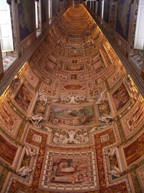 Now we are entering the map room. It has maps of all the regions of Italy. But the ceiling frescoes are pretty amazing. This picture is rotated upside down so the frescoes make sense visually.